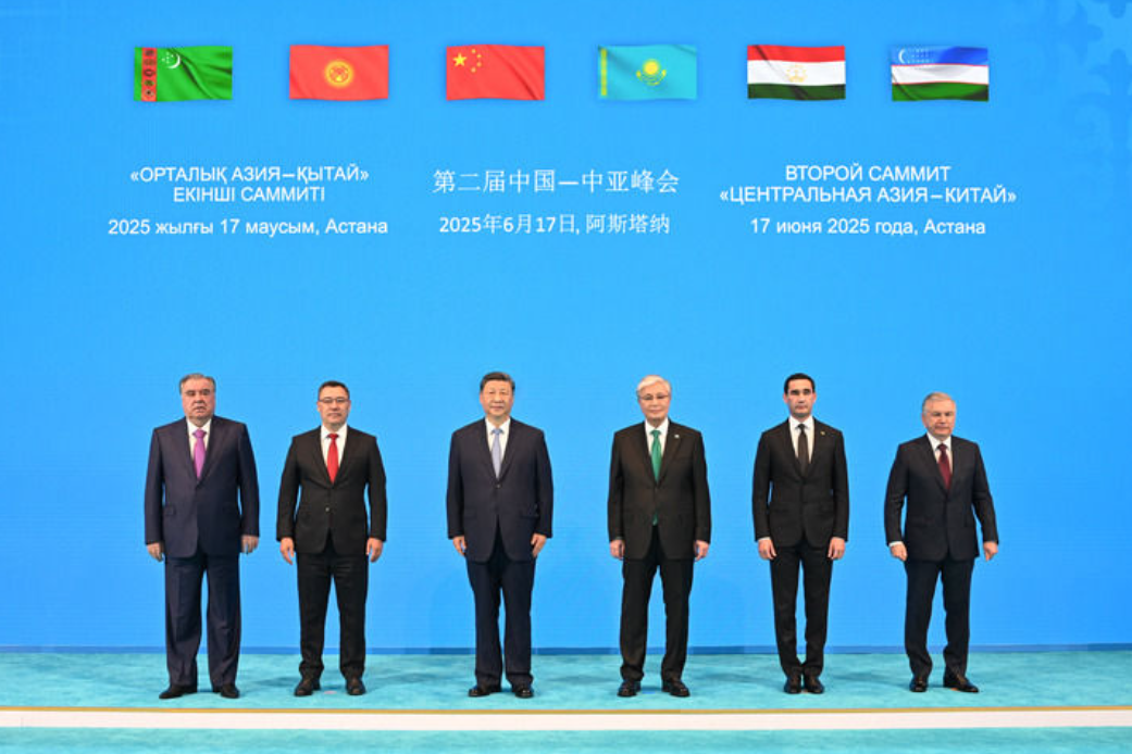 当地时间6月17日下午,第二届中国-中亚峰会在阿斯塔纳独立宫举行。哈萨克斯坦总统托卡耶夫主持会议。中国国家主席习近平、吉尔吉斯斯坦总统扎帕罗夫、塔吉克斯坦总统拉赫蒙、土库曼斯坦总统别尔德穆哈梅多夫、乌兹别克斯坦总统米尔济约耶夫出席。这是习近平同中亚五国元首集体合影。新华社记者 谢环驰 摄
