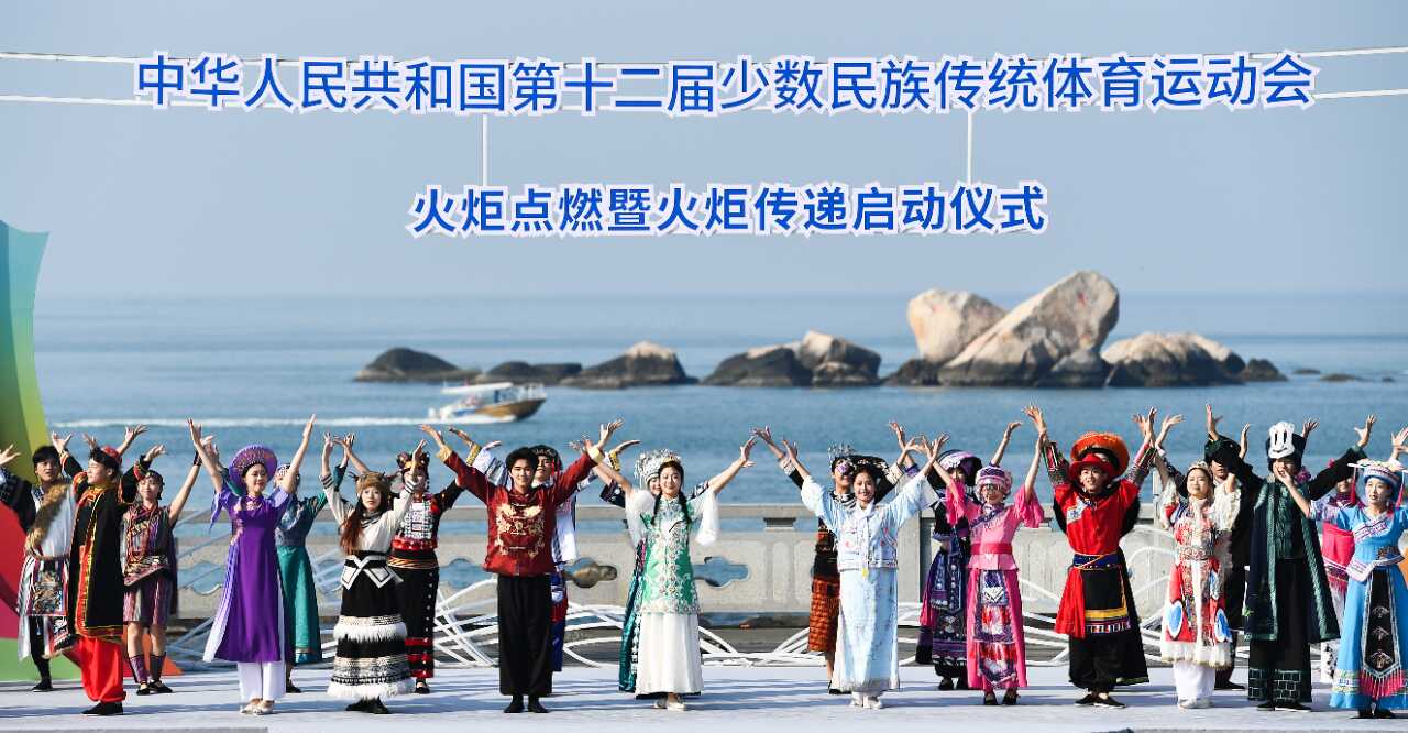 ▲10月9日,中华人民共和国第十二届少数民族传统体育运动会火炬点燃暨火炬传递启动仪式在三亚市天涯海角举行。本届运动会将于11月22日在海南三亚开幕,共有来自全国各地的35支代表队,56个民族的约7000名运动员参赛,比赛包括18个竞赛项目以及约170个表演项目。新华社记者 杨冠宇 摄