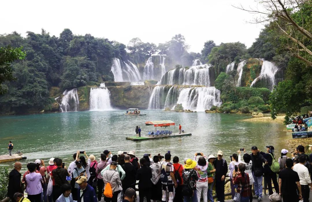 ▲中越德天(板约)瀑布跨境旅游合作区是由中国广西壮族自治区与越南高平省共同建设和实施的项目,是中国首个跨境旅游合作区。图为2024年12月5日,游客在中越德天(板约)瀑布跨境旅游合作区中国一侧游览。 新华社记者 金皓原摄